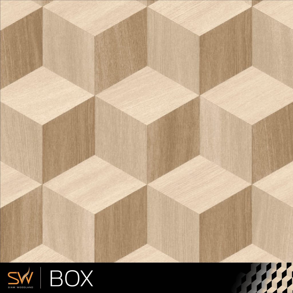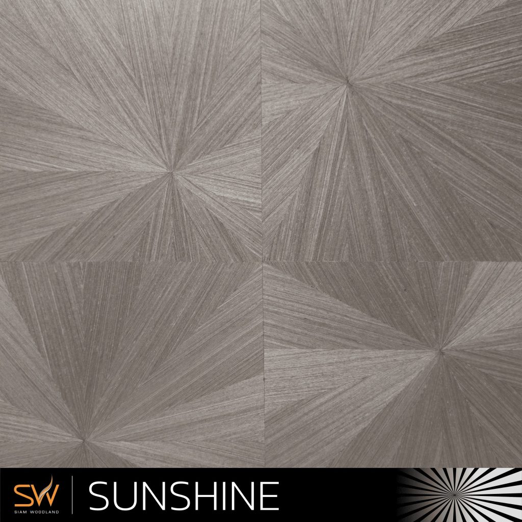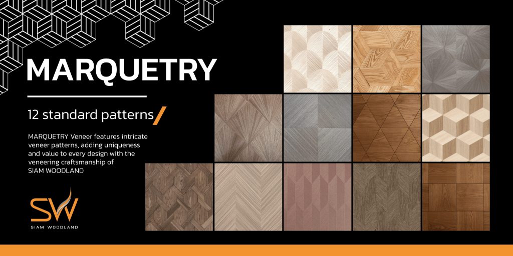 คอลเลกชันไม้จัดลาย (Marquetry Veneer) มาพร้อมกับ 12 ลายมาตรฐานจากทาง Siam Woodland ถูกออกแบบมาเพื่อสร้างเอกลักษณ์เฉพาะตัวให้กับทุกพื้นที่ ตั้งแต่ลายลูกบาศก์เรขาคณิตที่ร่วมสมัย ไปจนถึงลวดลายรัศมีตะวัน (Sunshine) อันประณีต ทุกชิ้นงานสะท้อนถึงศิลปะแห่งงานไม้วีเนียร์คุณภาพจากทีมงาน Siam Woodland