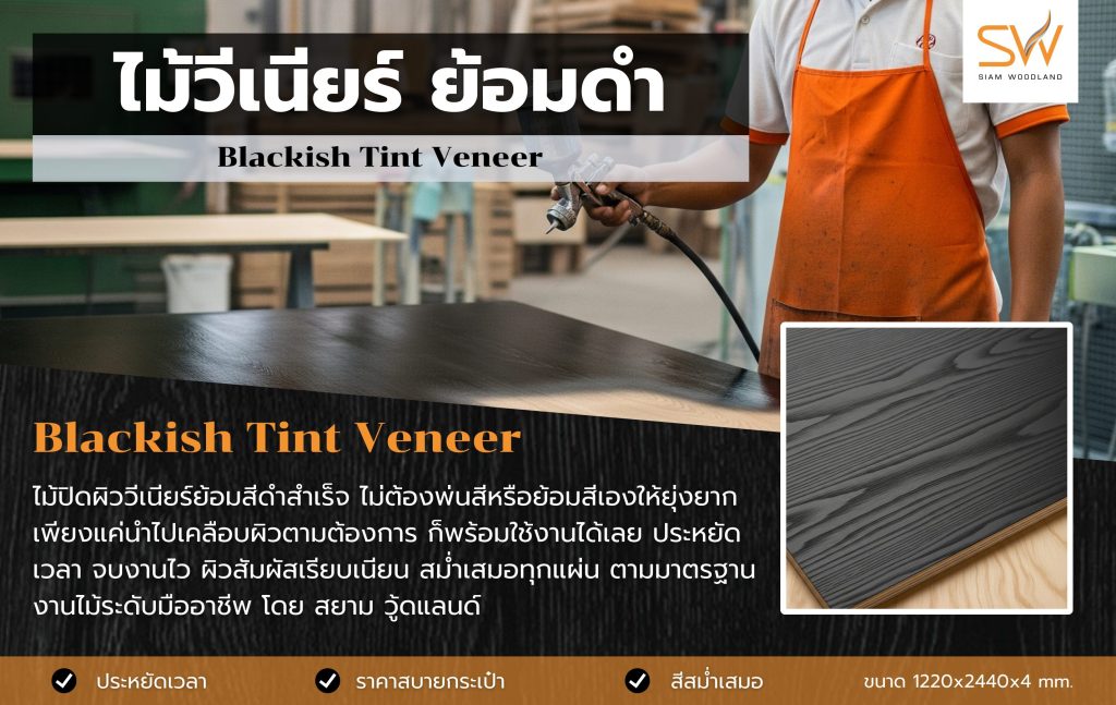 พร้อมใช้งาน: ไม้ปิดผิววีเนียร์ย้อมสีดำสำเร็จรูปของ SW ช่วยลดความยุ่งยากในการย้อมสีหรือพ่นสีด้วยตัวเอง เพียงแค่เคลือบผิวหน้า (Top coat) ก็พร้อมสำหรับการติดตั้งได้ทันที