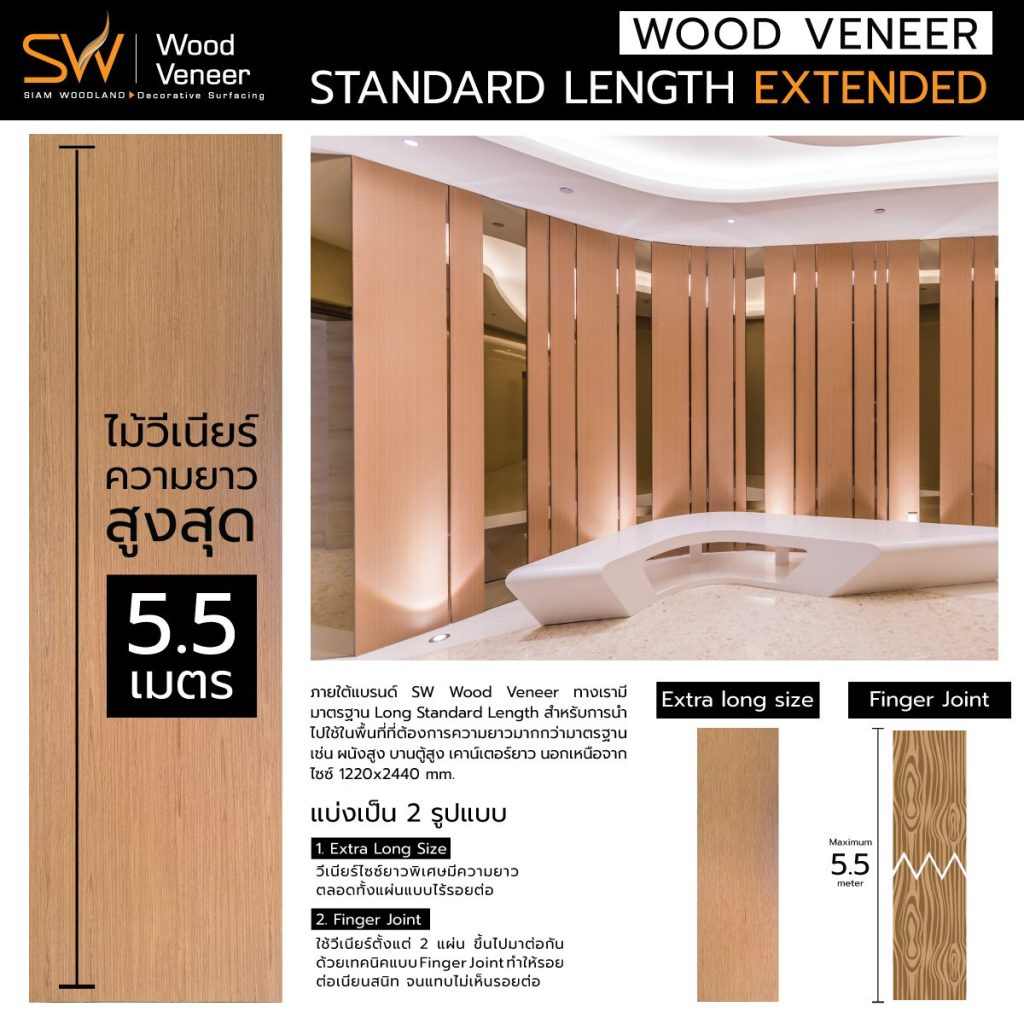 ภายใต้แบรนด์ SW Wood Veneer ทางเรามีมาตรฐาน Long Standard Length สำหรับการนำไปใช้ในพื้นที่ที่ต้องการความยาวมากกว่ามาตรฐาน เช่น ผนังสูง บานตู้สูง เคาน์เตอร์ยาว นอกเหนือจาก ไซซ์ 1220×2440 มม. ความยาวสูงสุดอยู่ที่ 5.5 เมตร