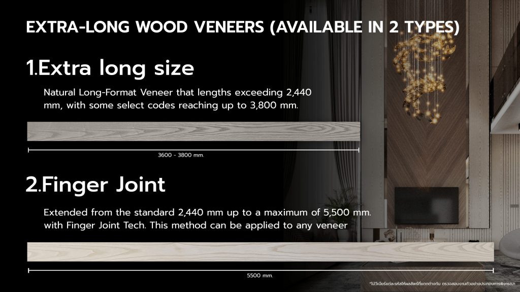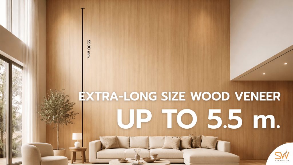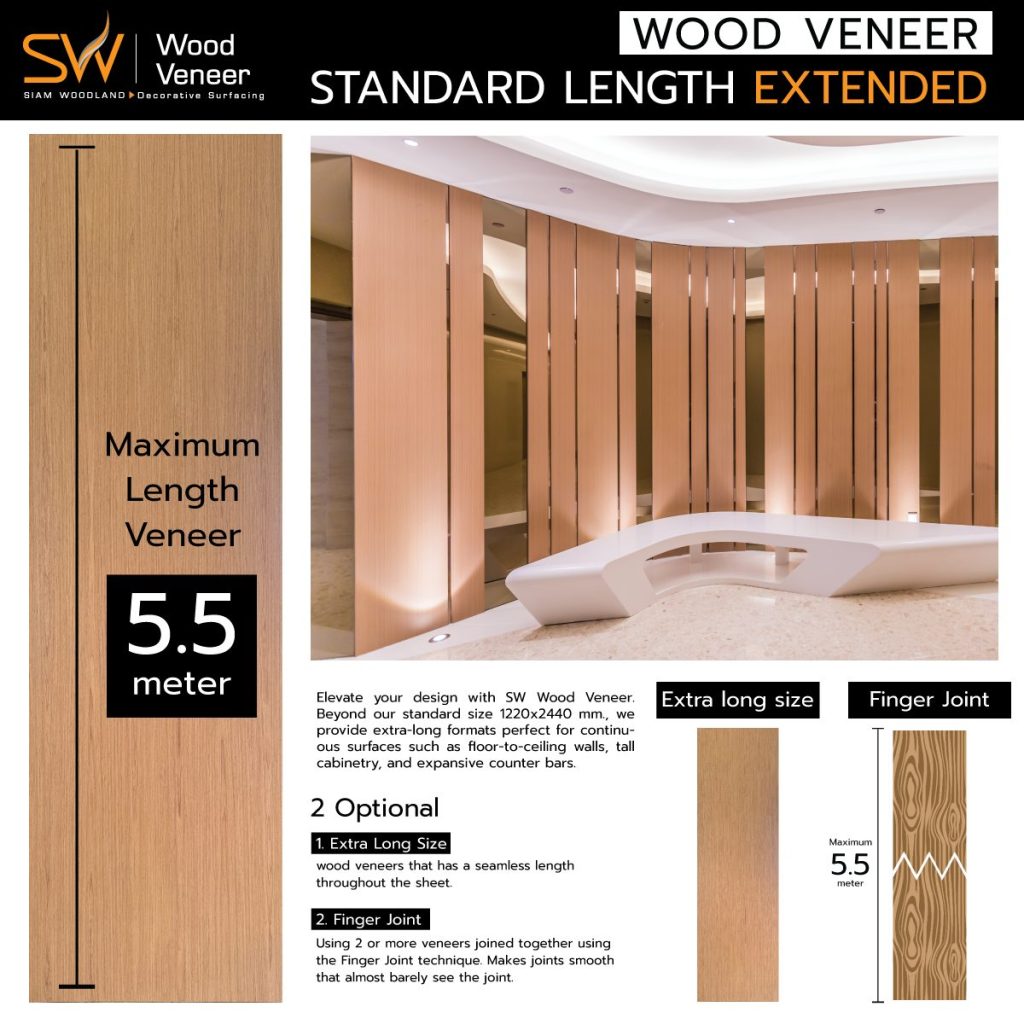 Elevate your design with SW Wood Veneer. Beyond our standard size 1220×2440 mm., we provide extra-long formats perfect for continuous surfaces such as floor-to-ceiling walls, tall cabinetry, and expansive counter bars. Maximum length is 5.5 meter.